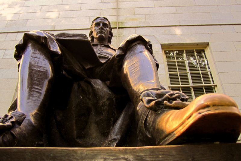 为了表彰哈佛的功绩,1639 年3 月,马萨诸塞法院下令将学院命名为哈佛学院。1884 年10 月,著名的哈佛铜像在校园揭幕,由 30 年后创作林肯塑像的著名艺术家法兰奇完成。但因为没有任何哈佛的照片和描述可资参考,法兰奇便选定 1882 级哈佛法学院学生霍尔的头部做原型,身体部分则另外聘请模特摆出坐姿。哈佛雕像1924 年从旧址迁到哈佛校园,他的左脚尖在亿万人的“百年抚摸”中明光锃亮,映照出四海学子对知识的渴望和对前程的梦想。
