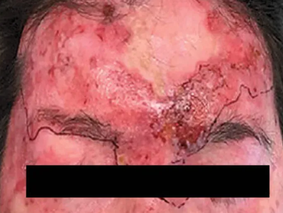 皮肤鳞癌在上次手术植皮区域外复发。图片来自本案例文献