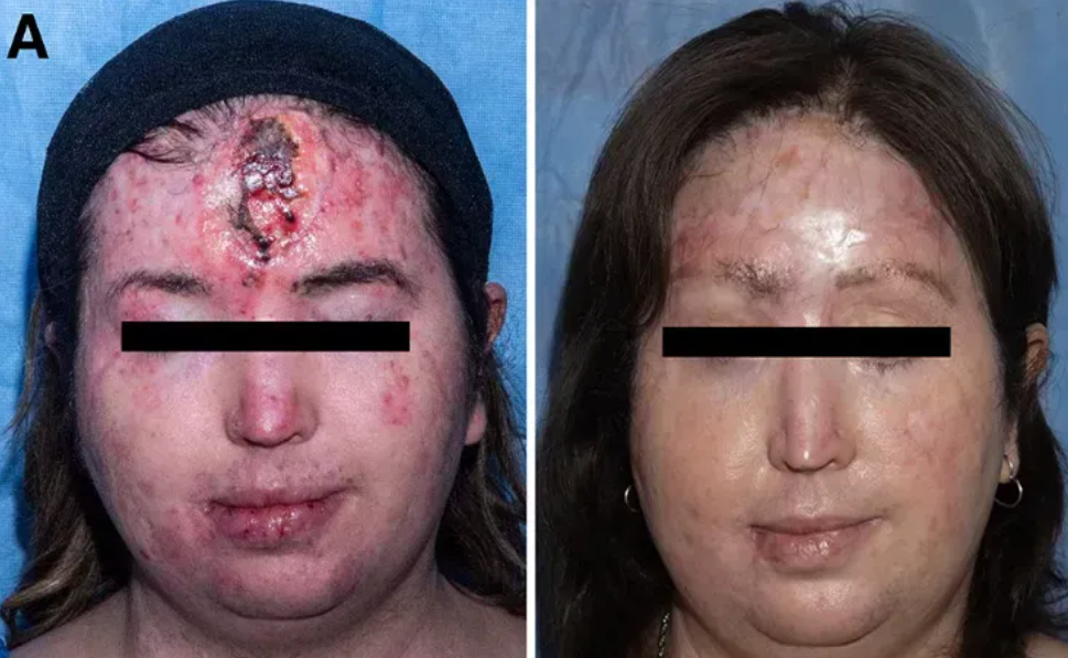 左图为皮肤鳞癌第二次复发,右图为造血干细胞移植后 33 个月。图片来自本案例文献