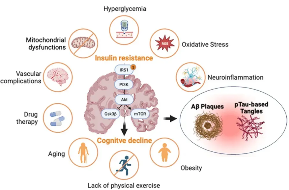 更深层的变化则发生在细胞内部:氧化应激、线粒体功能紊乱、蛋白质异常磷酸化等过程不断累积,进一步强化脑胰岛素抵抗,与认知能力下降风险密切相关[2,4],让大脑变得更加迟钝。