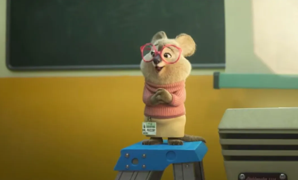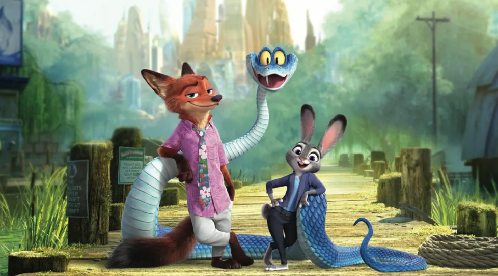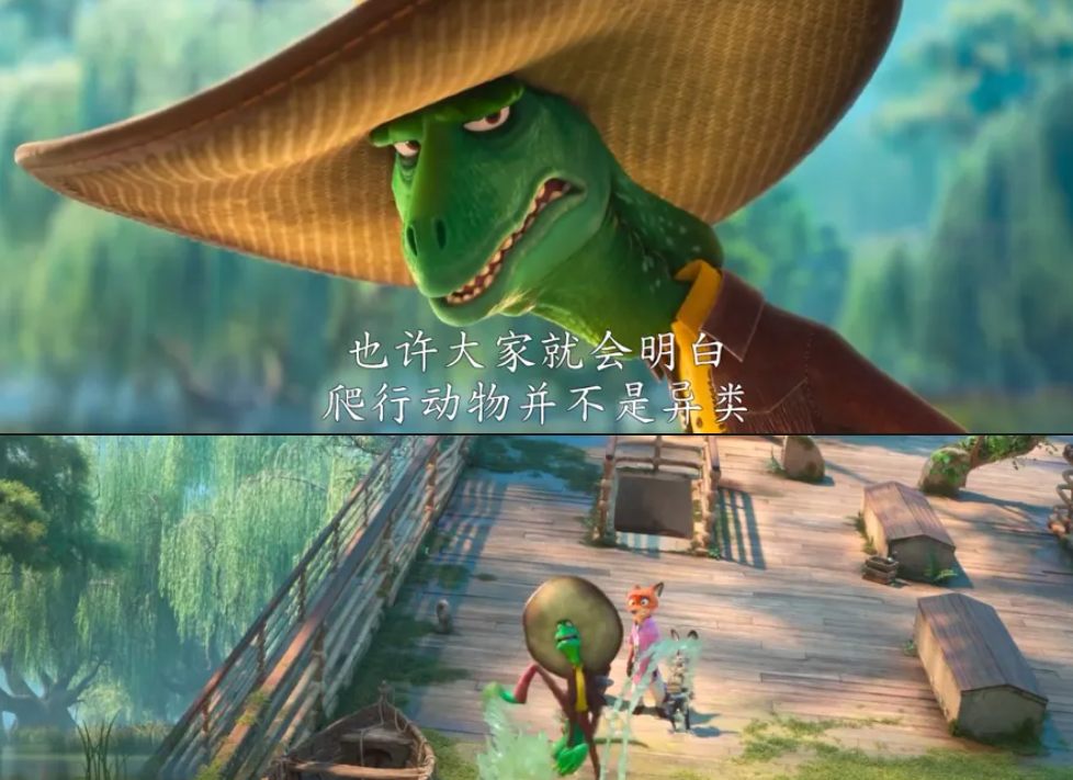 电影开篇先回顾了第一部的内容:绵羊市长想要陷害肉食动物,被朱迪和尼克识破。这里英文字幕把前情提要的 before 改写为 be-fur,中文则选择了“前情蹄要”。这个翻译不错,但还是少了一个微小的呼应。毛发(fur)是哺乳动物的核心特征之一,前作里的动物都是哺乳动物,本作就开始重点关注爬行动物了。