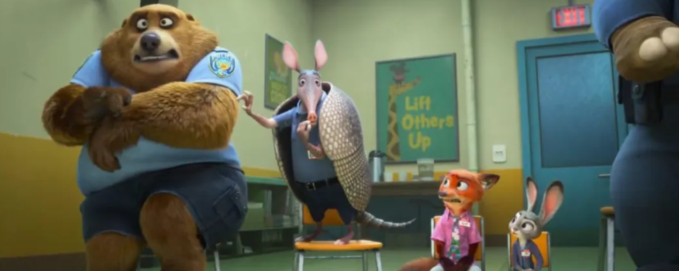 犰狳警官(忍不住去挠自己灰熊同伴的毛的那位)有一个奇怪的设计:他的警服是在甲壳里面的,壳像披风一样套在警服外。这个实际上是做不到的,犰狳的壳长在身上拿不下来。其他动画片里乌龟壳也经常被当成可穿戴装备,那个更加离谱,因为乌龟的壳是和骨骼直接连在一起的。