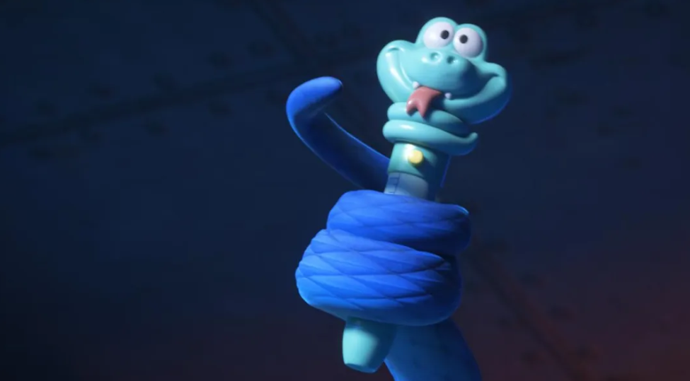 盖瑞脸部还有一个值得注意的点是眼睑。蛇其实并没有眼睑,只有一层透明角质,不能眨眼。但这样会损失太多面部表情,所以动画组只好在眼睛上面加了一个尖角型的鳞片结构,同时充当眼睑和眉毛。