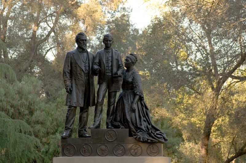 斯坦福大学的建立是一段凄美动人的故事。1884年,加州前任州长、中央太平洋铁路公司总裁斯坦福一家赴欧洲旅行。15 岁的独生儿子小斯坦福不幸患伤寒病,于3月13日在意大利佛罗伦萨去世。斯坦福和妻子珍妮悲痛欲绝,决定以儿子的名义,在加州建立一所大学。他们说“加州的孩子都是我们的孩子”。这年 5 月,夫妻二人先后到哈佛、康奈尔、麻省理工学院等名校考察咨询。1885 年11 月11 日签署了法律文件,承诺拿出 19000 英亩的葛瑞德里农场,55000英亩的蒂荷马农场和 8800 英亩帕罗奥多马场以及家庭其他财富用来办学,总数超过 4000 万美元。1887 年5 月14 日是小斯坦福 19 岁生日,校园正式破土动工。纽约媒体曾经预言,斯坦福的教授只能“在大理石会堂里对空板凳讲课”。但1891 年 10 月 1 日开学时,学校已拥有教师15 人和学生465人。宗教自由,男女合校,贫富平等,印第安纳大学校长乔丹成为斯坦福大学的第一任校长。珍妮在开学典礼上情绪过于激动,以致不能发表精心准备的致辞。