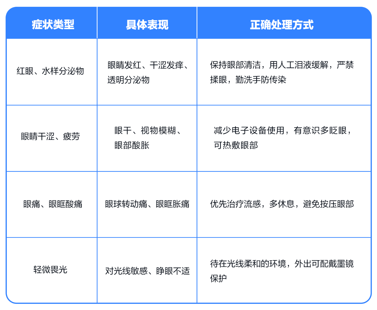 2. 眼睛干涩、疲劳感主要因流感发烧导致身体脱水,泪液分泌减少,加上患病期间如果持续长时间看电子设备、眨眼频率降低也会加重不适感。