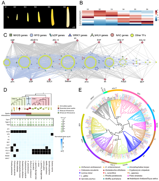 研究团队系统比较天南星科MADS-box基因,发现红掌保留AGL6、SOC1等核心MADS-box基因,而部分近缘物种已发生不同程度的基因缺失。该结果表明,MADS-box基因的谱系特异性保留可能驱动了红掌呈现出介于“原始型”与“进化型”之间的过渡花序特征,不仅深化了对红掌花序形成机制的理解,也为解析天南星科植物独特花序结构的演化路径提供了新的分子证据。