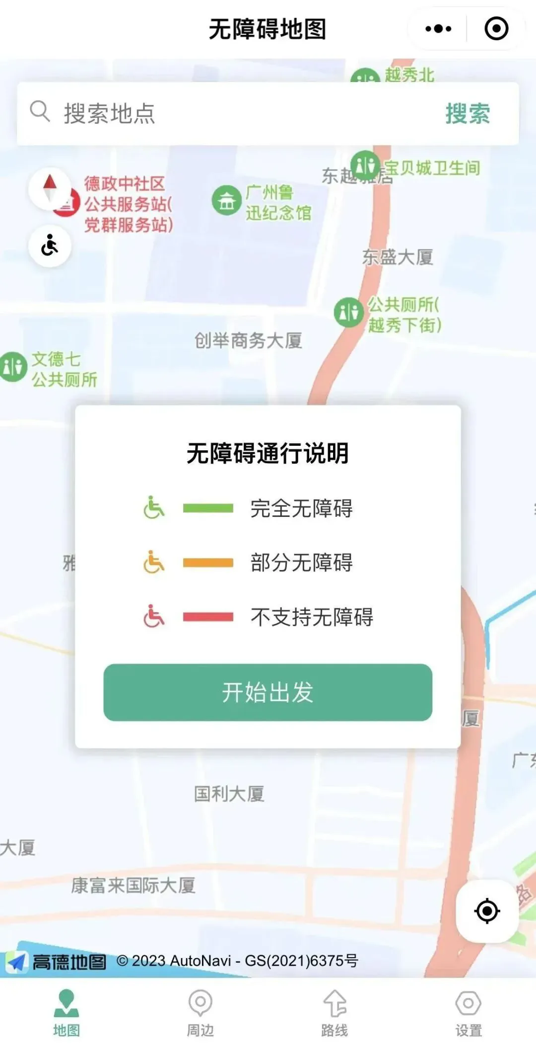 2022年,高德地图联合阿里巴巴公益上线了我国首个面向全国范围的无障碍地图导航。它通过无障碍设施数字化,解决轮椅人群的无障碍信息盲区问题。