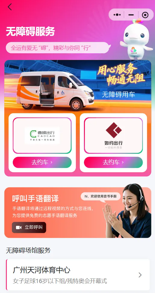 为迎接十五运会和残特奥会诞生的这款小程序,整合了“无障碍服务”模块,打通无障碍用车预约、场馆无障碍地图等数据及服务信息,在赛会期间为残障人士提供即时服务。