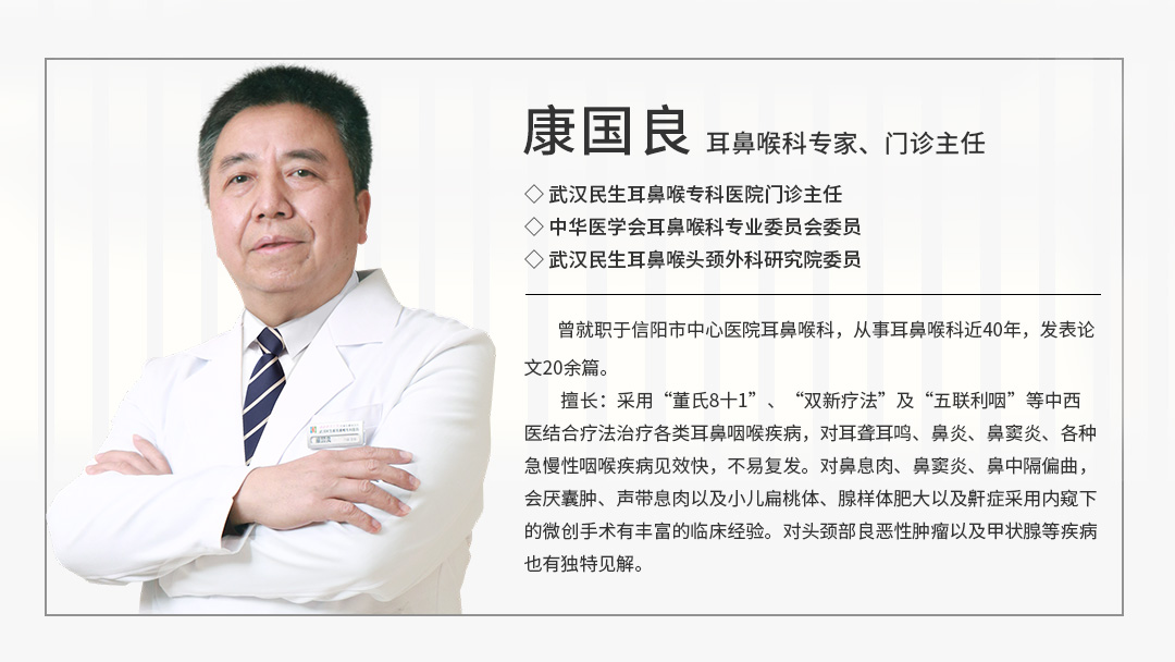 擅长:采用“董氏8+1”、““双新疗法”及“五联利咽”等中西医结合疗法治疗各类耳鼻咽喉疾病,对耳聋耳鸣、鼻炎、鼻窦炎、会厌囊肿、声带息肉以及小儿扁桃体、腺样体肥大以及鼾症采用内窥下的微创手术有丰富的临床经验。