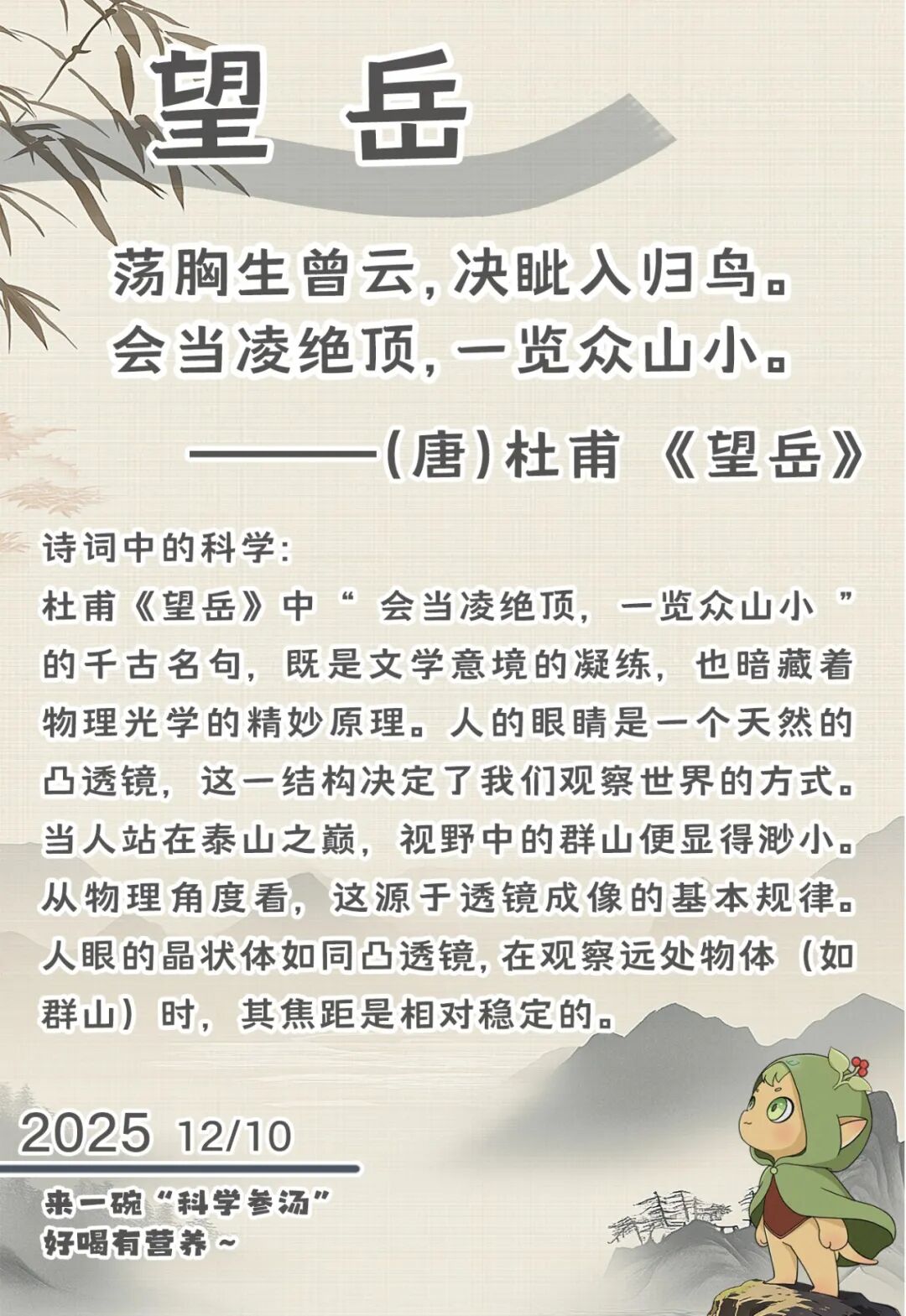 人眼焦距基本固定,物距是景物到眼睛的距离,像距为晶状体到视网膜的距离。杜甫登顶后,与群山的物距大幅增加,焦距不变则像距必然缩小,视网膜上的影像随之变小——这便是“众山小”的科学本质。同时,高处视野开阔,缺少近处景物对比,更会强化“景物缩小”的视觉感受。