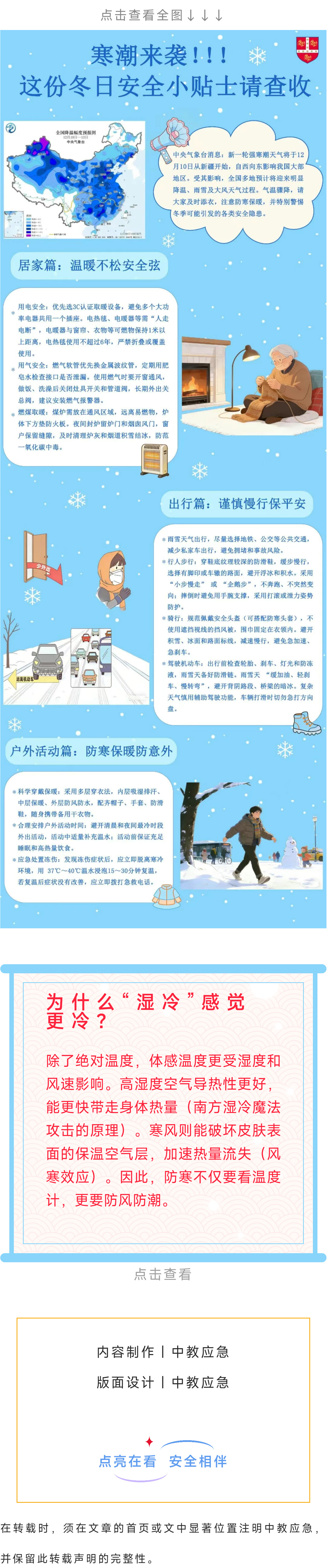 图文简介: 寒潮来袭,大家要及时添衣,注意防寒保暖,同时也需要警惕寒潮带来的安全隐患,我们整理了居家、出行、外出活动三个方面的安全事项,希望能为大家在冬日温暖中增加安全的保障。