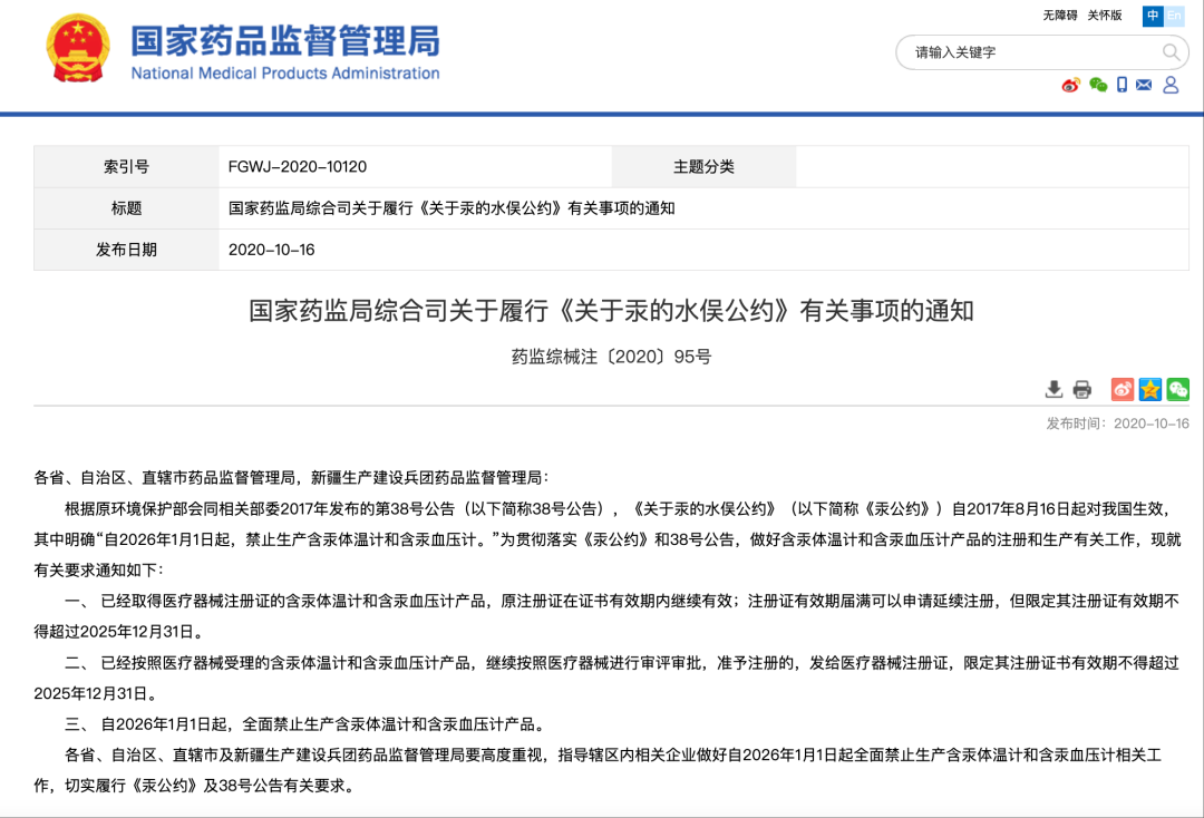 实际上,国家药监局综合司关于履行《关于汞的水俣公约》有关事项的通知是2020年发布的。其中提到:已经取得医疗器械注册证的含汞体温计和含汞血压计产品,注册证有效期不得超过2025年12月31日。