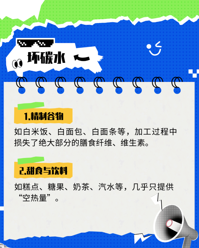坏碳水多为精加工或添加大量糖的食品。好吃到令人上瘾,但是营养价值低,几乎只提供能量,升糖速度快,易引发血糖骤升骤降,导致“过山车式”的饥饿感,饱腹感差,很容易进食过量。长期大量食用坏碳水,会增加肥胖、糖尿病、心血管疾病等慢性病发生风险。以下几类食物属于此类: