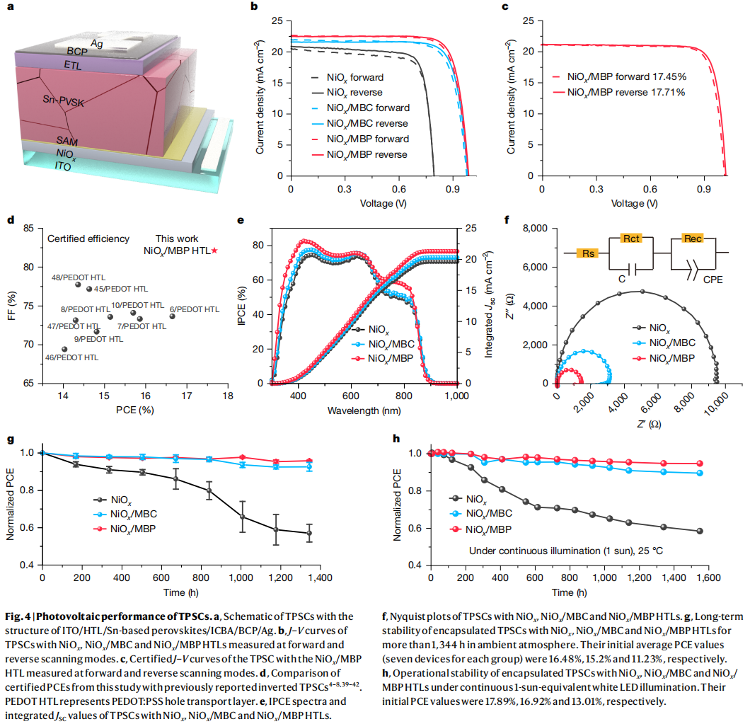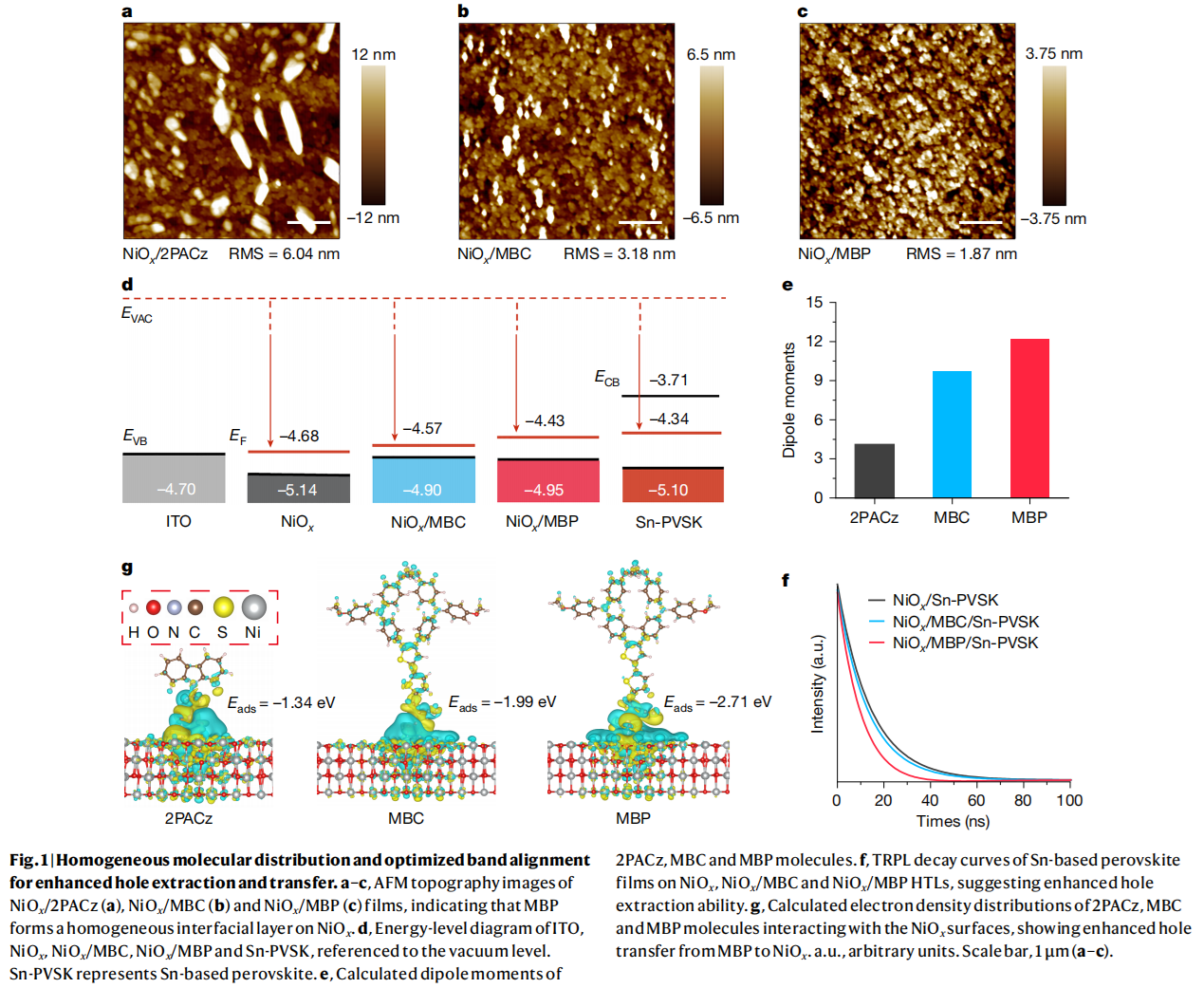 一方面是性能瓶颈。传统空穴传输层材料要么像PEDOT:PSS那样“娇弱”——怕水怕光还呈酸性,会加速锡基钙钛矿降解;要么如NiOₓ存在能级不匹配、氧空位等问题,导致电荷提取效率低下,让电池实际效率长期徘徊在16%左右,难以与成熟铅基电池抗衡。