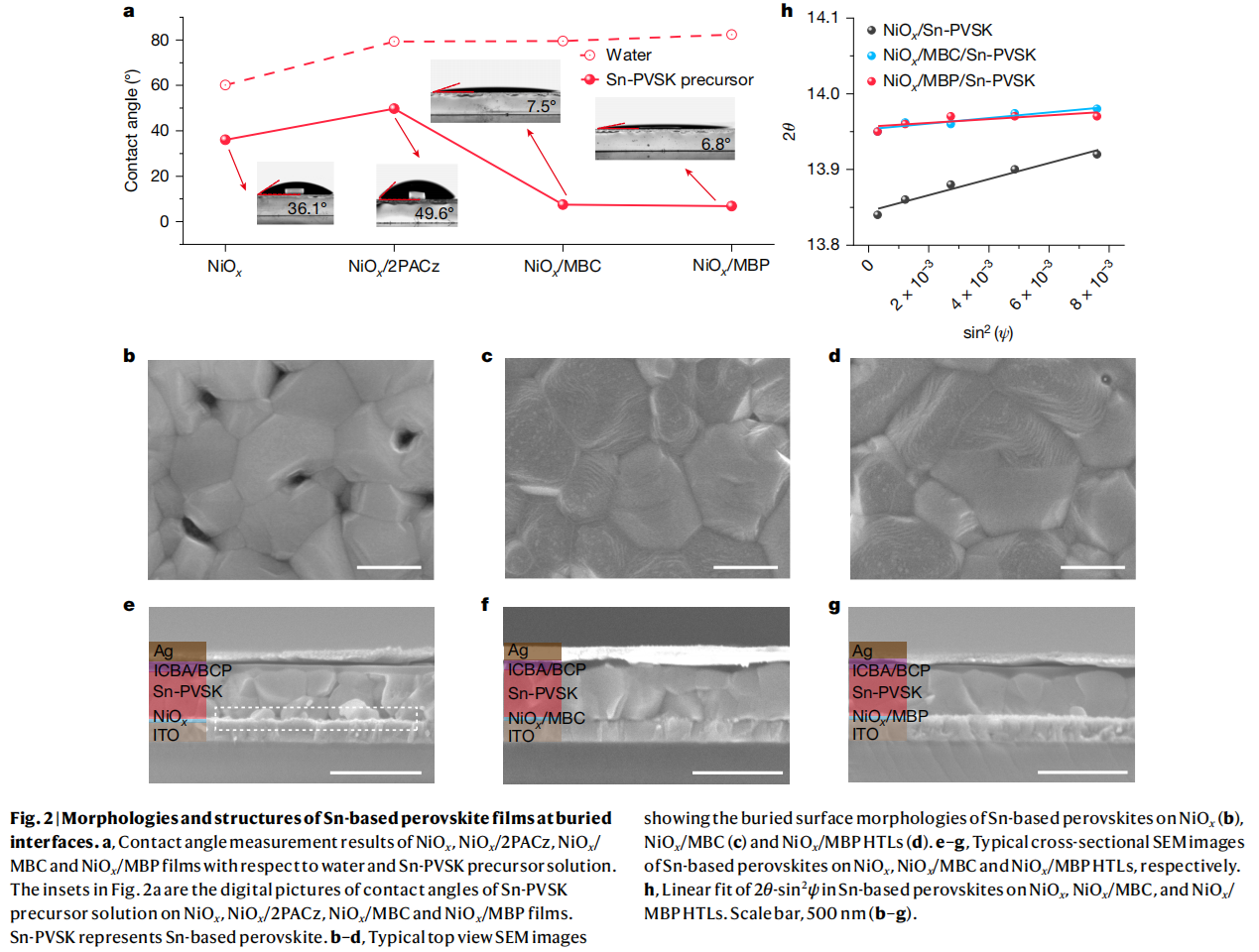 MBP层对钙钛矿前驱体溶液展现出超强润湿特性,接触角小于10°,让溶液能均匀铺展,彻底告别了传统界面“疏水洼地”的问题。这一特性引导钙钛矿形成致密、无针孔、结晶性极佳的高质量薄膜,有效抑制了非辐射复合损失,让电池性能更上一层楼。