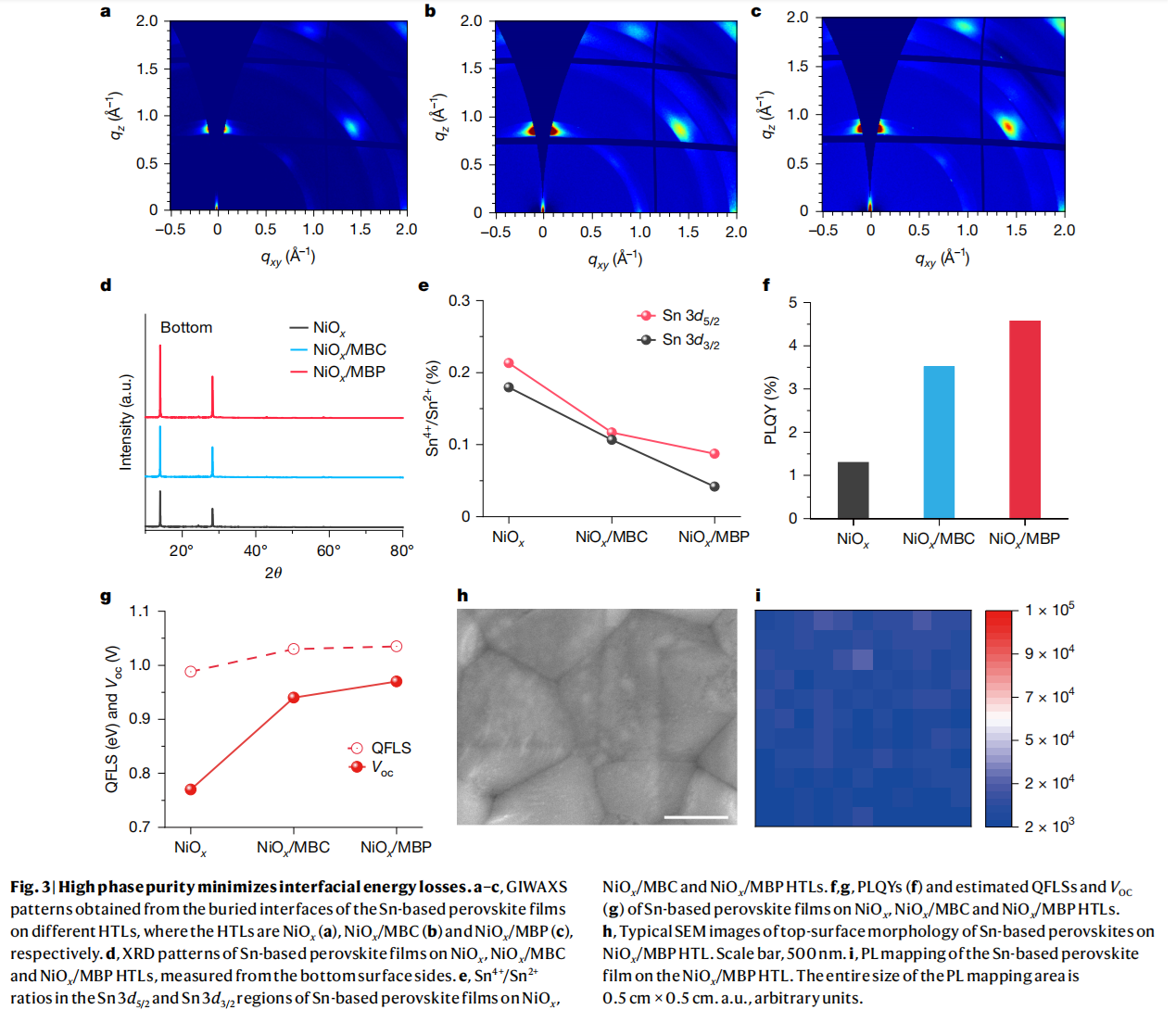 MBP分子能精准调整界面电子能级结构,其修饰后的NiOₓ HOMO能级为-4.95eV,与锡基钙钛矿的价带顶(-5.10eV)高度契合,就像搭建了一座平缓的能量阶梯,让光生空穴毫无阻碍地快速传输,极大减少了能量损失。实验数据显示,搭载MBP的电池光致发光寿命显著缩短,空穴提取效率实现质的飞跃。