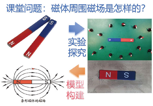 以初中磁学的新授课为例,如图1所示,教师一般先通过实验进行现象探究和归纳,再构建模型与事实进行印证,帮助学生建立概念。但初中生在建立磁场概念时,想象磁感线的空间分布存在一定困难,将增强现实用于辅助物理实验,使磁感线变得直观(图2),有助于提升教学效果。