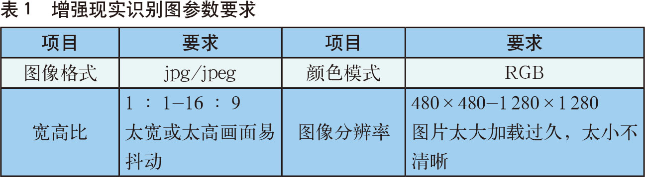 为了让识别更准确,识别图的选取有严格要求。增强现实平台是通过图像内容的色块、形状等细节确定识别图的位置和状态,应尽量选取锐利、清晰、细节丰富、高对比度的图像作为识别图,不选过高、过宽、内容简单重复、大色块多、空白太多、模糊的识别图,从而增加识别的稳定性。具体细节参数详见表1。