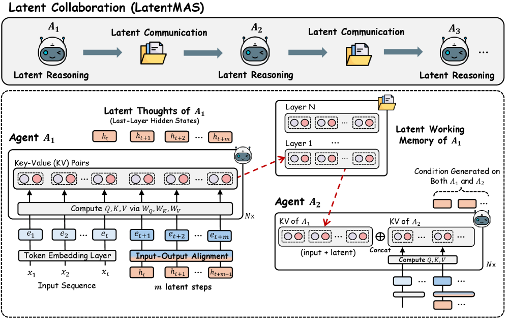 本文提出 LatentMAS——一种端到端、无需训练的框架,支持 LLM 智能体之间纯粹的隐空间协作。在 LatentMAS 中,每个智能体首先通过最后一层隐藏状态嵌入,自回归地生成隐空间思维表示;随后,共享的隐空间工作记忆保存并传递各智能体的内部表征,确保信息交换无损。