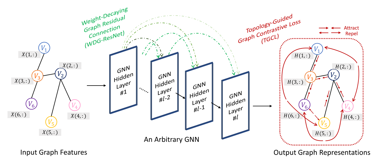 本文提出了一种名为 Deeper-GXX 的图神经网络(GNN)新方法。该方法由两个核心模块构成:权重衰减图残差连接模块(Weight-Decaying Graph Residual Connection, WDG-ResNet)和拓扑引导图对比损失函数(Topology-Guided Graph Contrastive Loss, TGCL)。WDG-ResNet 通过引入动态权重衰减机制,有效缓解梯度消失问题,同时抑制阴影邻居效应;TGCL 则利用图的拓扑结构引导对比学习,增强节点表示的判别能力,抑制过平滑。
