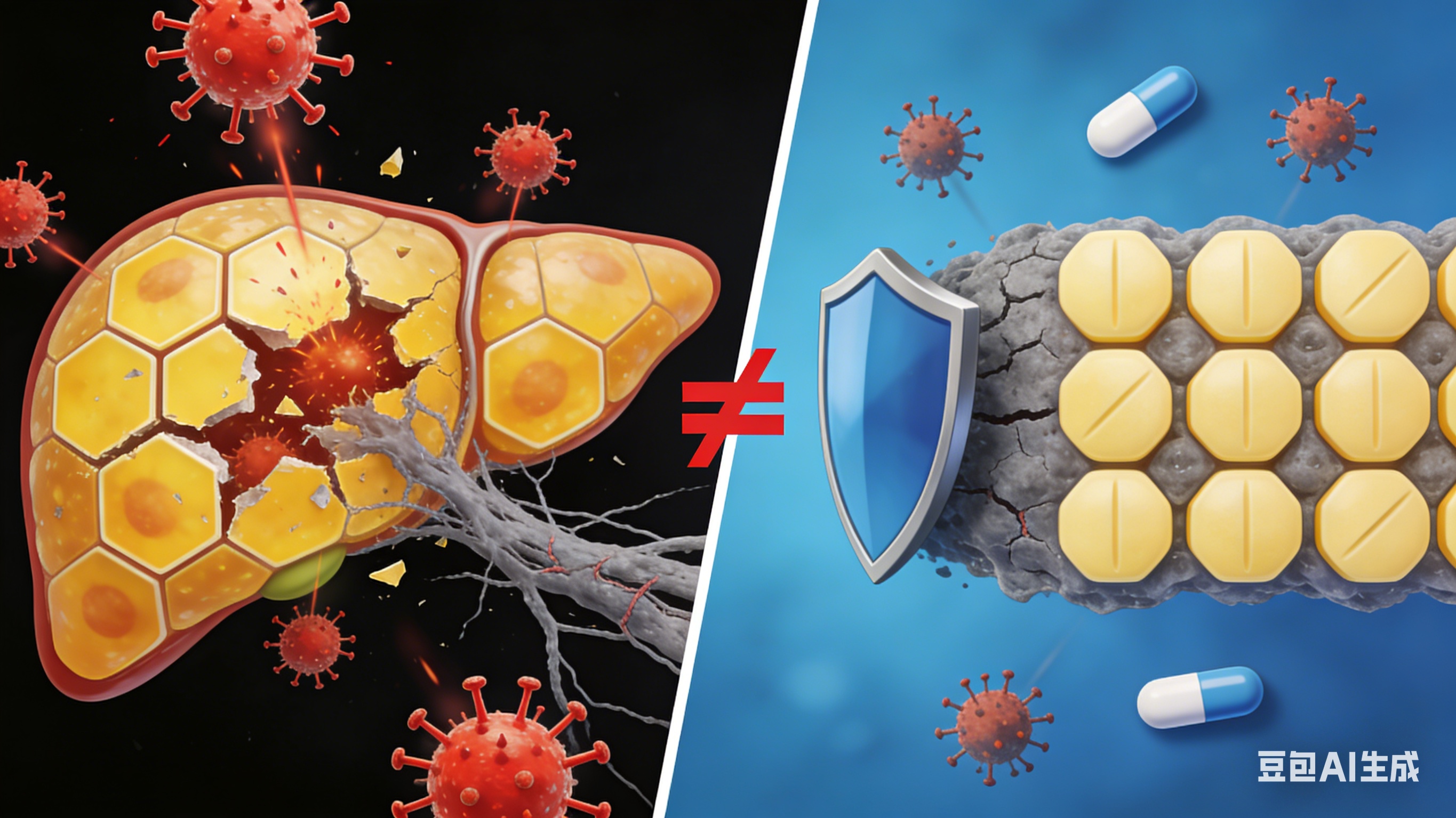 1.混淆因果关系:乙肝肝硬化的根源是病毒持续复制,反复攻击肝细胞,导致肝组织 “损伤 - 修复 - 纤维化” 的恶性循环。抗病毒药物的作用是抑制病毒,从根源阻断损伤,而谣言却把 “疾病本身会进展” 的锅甩给了 “治疗”,就像把 “消防员灭火” 说成 “消防员导致火灾蔓延” 一样荒谬。
