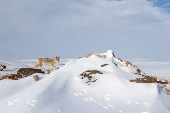 雪地里,一只郊狼和一只獾正在捕猎。仔细看,画面左侧可以看到獾的头部。(图片来源:NPS)