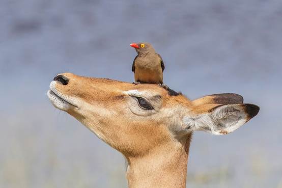 在黑斑羚头上的牛椋鸟(图片来源:Chobe National Park)