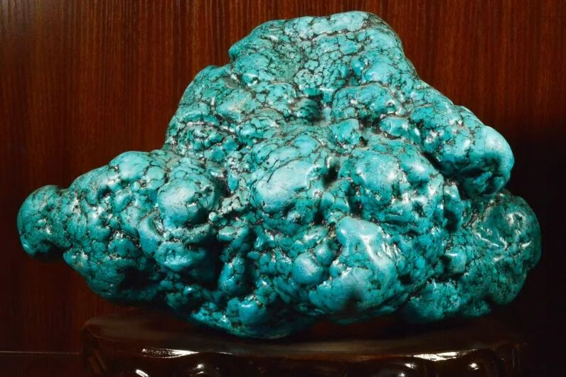 绿松石是一种含水的铜铝磷酸盐矿物,由于形似松球,色近松绿而得名,常形成于干旱地区富含铜、磷、铝的地质环境中,由于弱酸性的水溶解这些元素,并使它们发生反应,在特定的温度和压力下缓慢沉淀聚集而成。它的颜色主要取决于其中铜和铁的含量:铜离子多则偏蓝,铁离子多则偏绿。