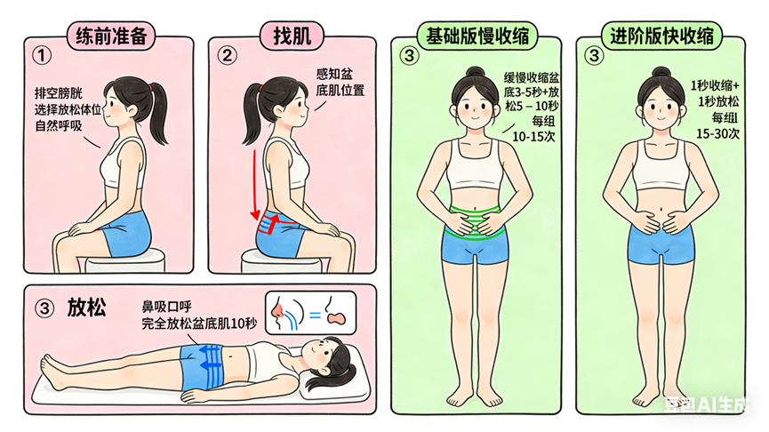 (1)慢肌训练(耐力):收缩盆底肌,保持3-5秒(初期可从2-3秒开始),然后完全放松5-10秒。每组10-15次,每天3-4组。