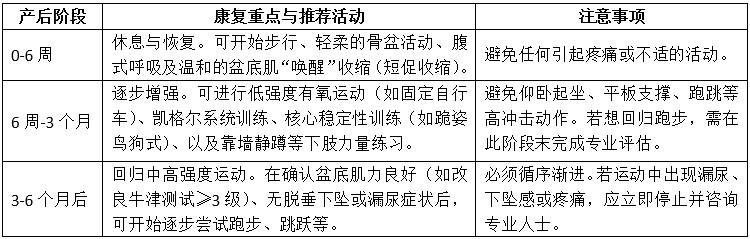全面的康复不止于盆底。根据国际产后康复指南,逐步恢复全身性运动对整体健康至关重要[4]。按产后时间顺序,康复重点与推荐活动有三个阶段: