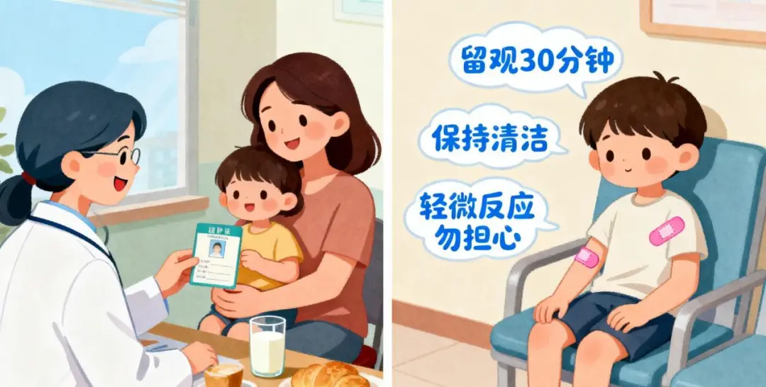 需在接种点留观30分钟,确认无皮疹、呕吐、头晕等急性不良反应;接种部位应保持清洁干燥,避免抓挠。如出现轻微红肿、疼痛或低热,通常1—2天可自行缓解;若症状持续或加重,应及时就医。