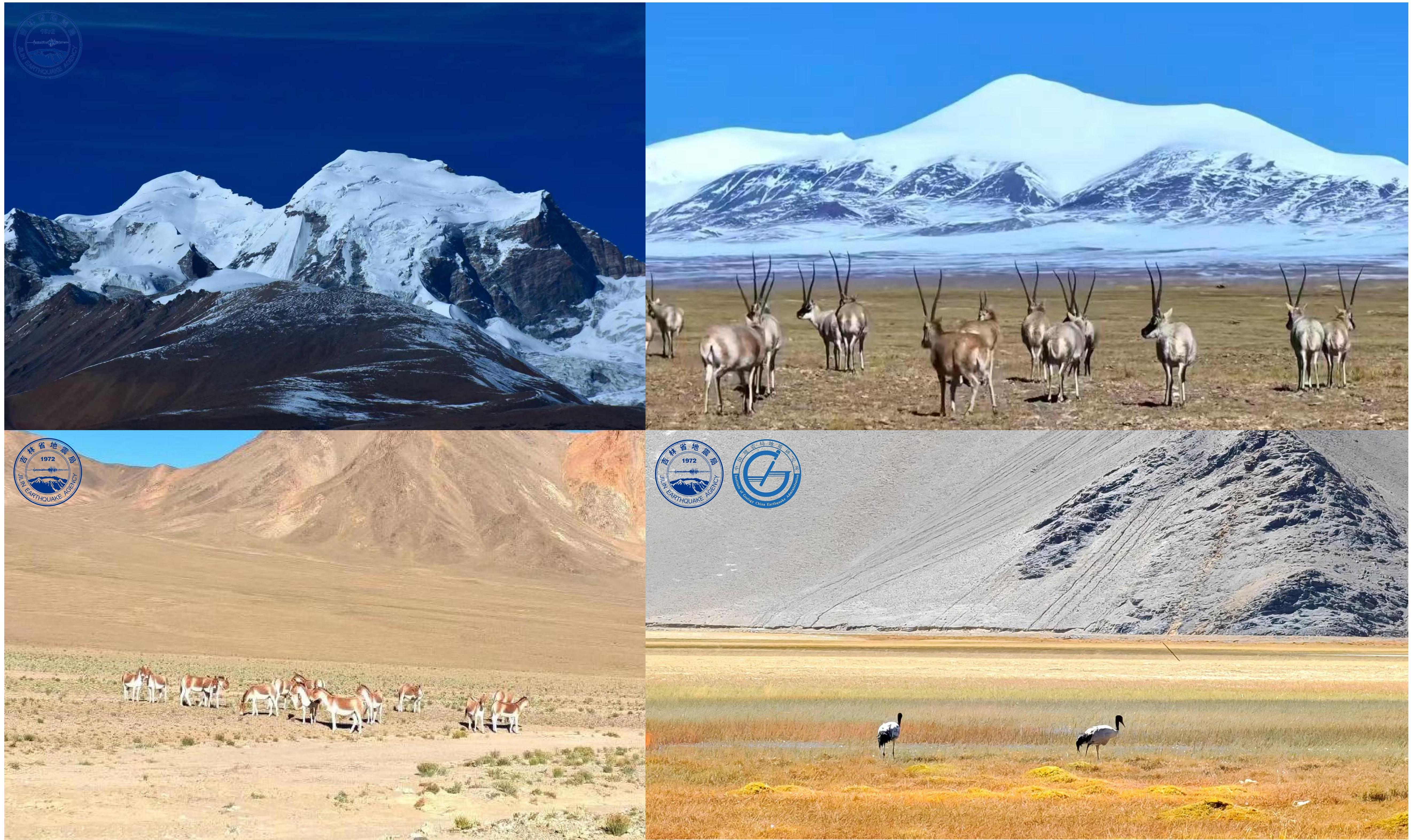 可可西里地区唐古拉山(上左一,原创图件)、藏羚羊(上右一,图源于网络)、藏野驴(下左一,原创图件)和黑颈鹤(下右一,原创图件)