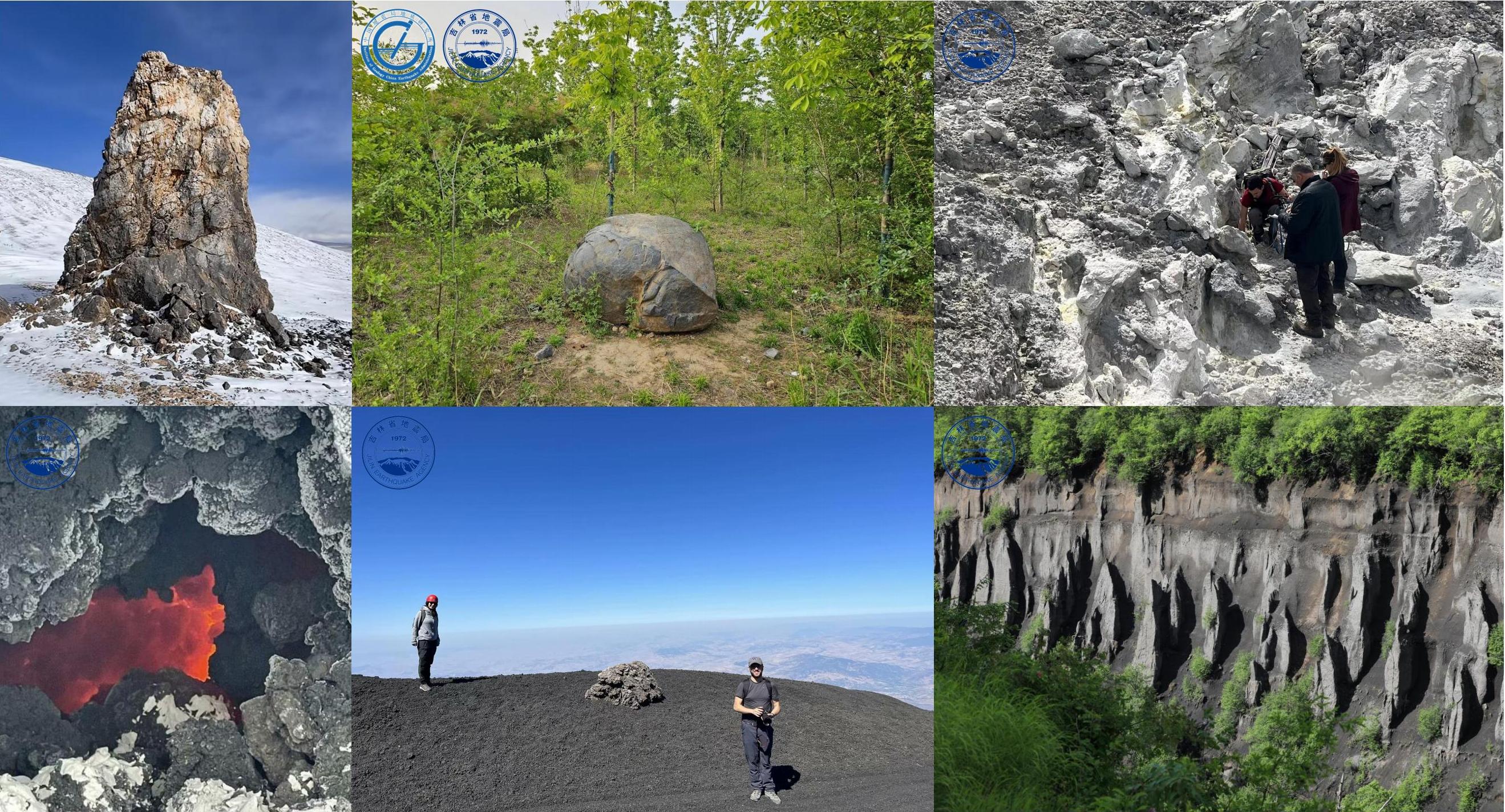 中国青海省可可西里火山群粗面安山岩(上左一)、中国河南省上峪火山玄武质火山弹(上左二)、意大利那不勒斯市坎皮佛莱格瑞火山流纹岩(上右一)、意大利卡塔尼亚市埃特纳火山喷口内部(下左一)与玄武质浮岩(下左二)和中国吉林省长白山天池火山区火山碎屑岩(下右一)(上左一图源于网络,其余均为原创图件)
