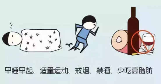 每星期做150分钟左右的中等强度有氧运动(如快走、慢跑、游泳),尽量不要长时间静坐。每天要保证7-8个小时的休息时间,不要经常熬夜,保持交感神经和副交感神经的平衡,降低血压波动,提高血管的弹性。