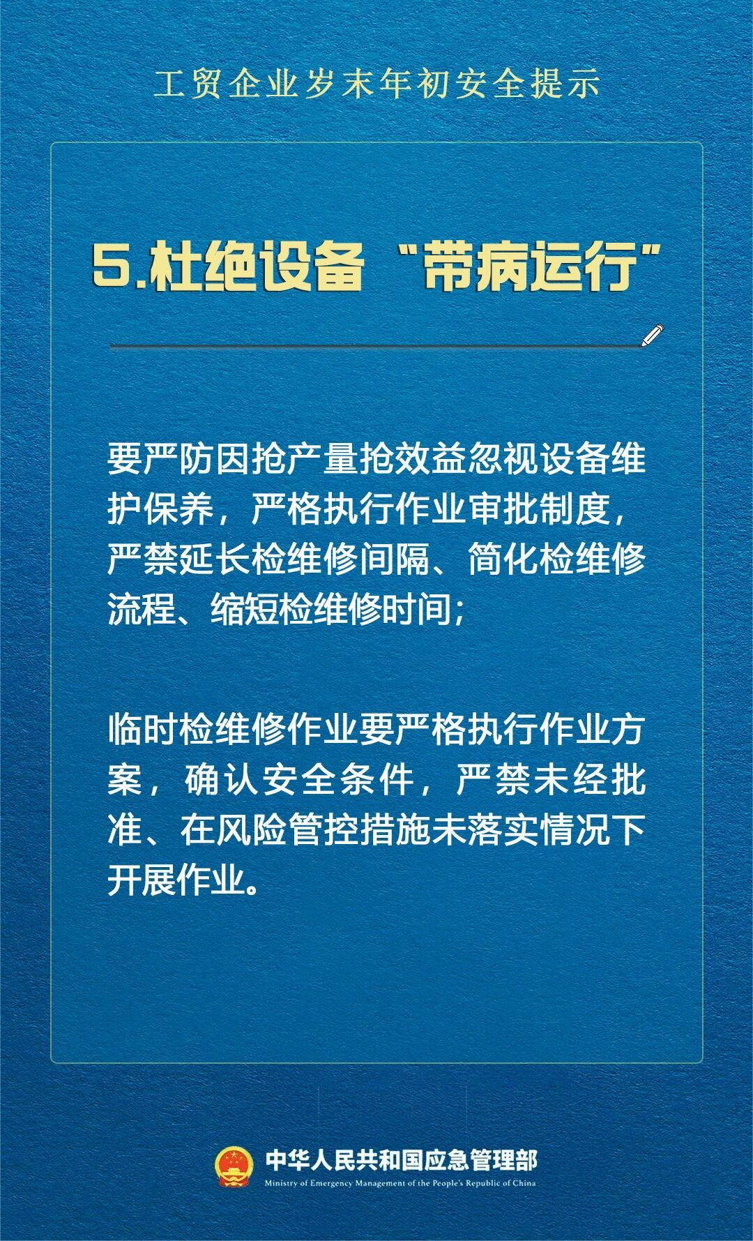 图文简介: 临近岁末年初,为推动工贸企业深刻吸取近期国内外事故教训,加强对低温雨雪冰冻天气、检维修增多、生产负荷增加等不利因素的安全管控,应急管理部向全国工贸企业发出安全提示。