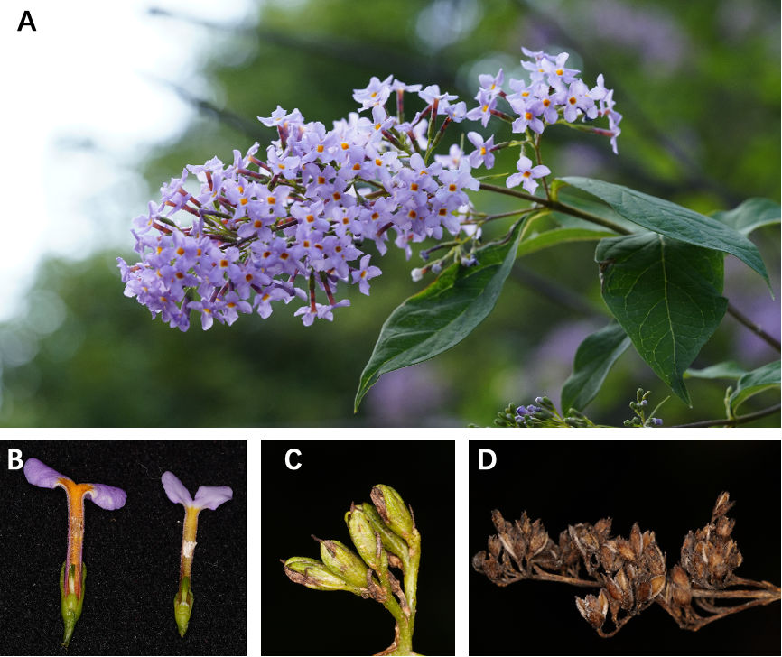 腺叶醉鱼草花果形态特征 图版A:腺叶醉鱼草花序;B:花内部形态;C:幼果;D:开裂的蒴果