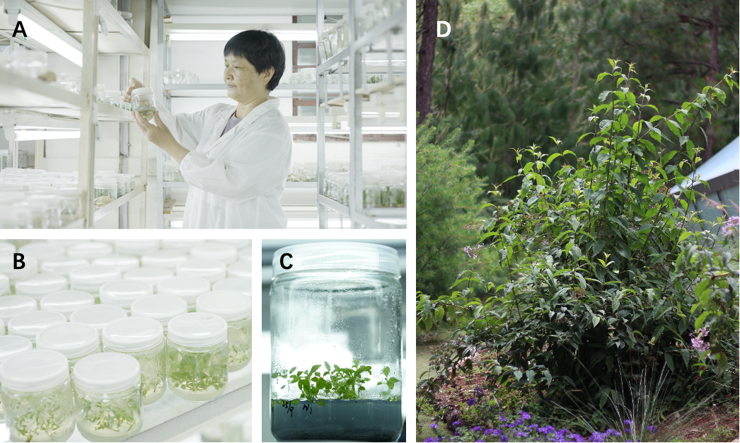 腺叶醉鱼草保护行动 图版 A、B:植物组织培养(陈旭 摄);C:中国西南野生生物种质资源库离体保存的幼苗;昆明植物园迁地保育的植株(唐凌云 摄)