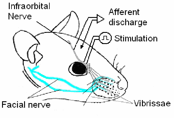 某个研究中对生物放电的记录标志,可以看出触觉须(vibrissae)下的黑点为毛囊,连接着面部神经(facial nerve)和眶下神经(infraorbital nerve)|Albarracín, Ana L. et al. (2007).