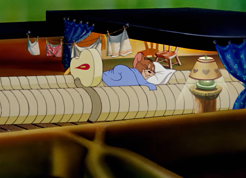 故事的开始,汤姆按下琴键,触发琴槌,惊醒了睡觉的杰瑞 图片来源:《猫和老鼠》旧版第29集