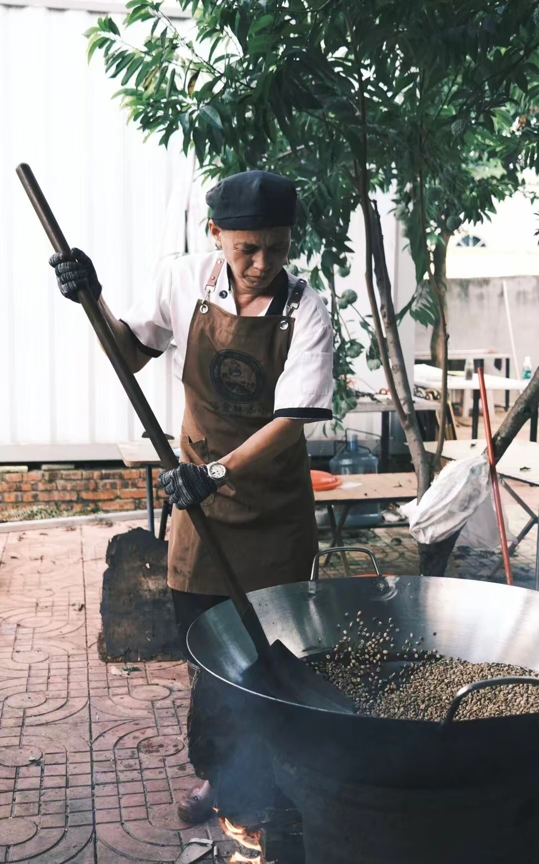 然而,真正让海南咖啡突破地域限制、走向大众视野的,并非仅仅是种植面积的庞大规模,而是其在加工与饮用环节所完成的一整套极具辨识度的本土化创新。例如,福山咖啡传承了“直火深度焙炒”及“焦糖裹香”的古法工艺,通过在烘焙后期融入糖浆,锁住浓郁焦糖香气;在兴隆,归侨们创新的“牛油咖啡”炒制法,则让咖啡豆在烘焙中吸收牛油与砂糖的风味,创造出口感极度醇厚、无需再加糖奶的独特饮品;文昌人把咖啡称为“歌碧欧”,这个发音源自东南亚海南华侨对咖啡的称呼“Kopi”。“歌碧欧”代表着一套特定的咖啡烘焙、冲调方式——把咖啡豆放入大铁锅中用柴火炒,冲泡时用有细长壶嘴的铁皮壶烧开水,随后将磨好的咖啡粉倒入纱布或毛巾漏子中,放进铁皮壶中上下拉动至少三次后,加入糖和奶便可饮用。这些本土化实践,让罗布斯塔在海南拥有了不同于西方咖啡美学的生命形态。