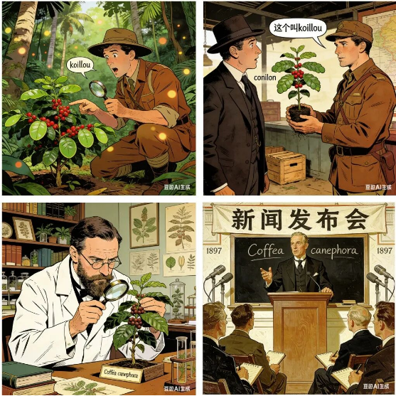 罗布斯塔的栽培历史可追溯至19世纪70年代的刚果洛马尼河流域。1880年法国探险家在加蓬和刚果河口之间的野外发现时,称其为柯林隆koillou——这个名字源自当地班图语对河流的称呼。种子传入巴西后,葡萄牙商人将其音译为conilon,从此科尼伦成为巴西罗布斯塔的别称。直到1895年,法国植物学家路易斯·皮埃尔在整理非洲植物标本时,才将其正式命名为Coffea canephora。1897年,弗罗纳在首次发表该名称及完整的物种描述,为这个即将改变全球咖啡产业的物种确立了科学身份。
