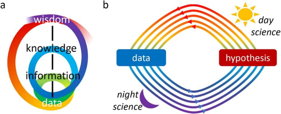 Y&L提出,数据—假说对话可以抽象为一个螺旋,在日科学和夜科学的迭代周期中发生。图片来源:Yanai, I., Lercher, M. The data-hypothesis conversation. Genome Biol 22, 58 (2021).