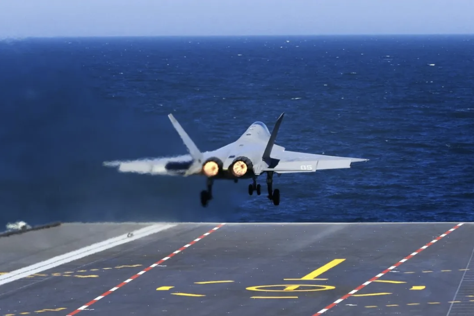 歼-35舰载战斗机在海军福建舰阻拦着舰后,飞行员向福建舰官兵竖大拇指。