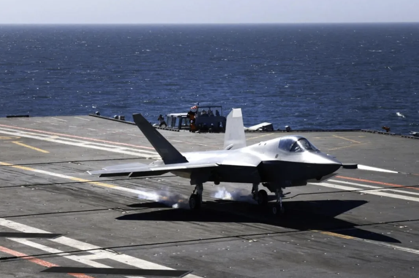 歼-35舰载战斗机在海军福建舰阻拦着舰。