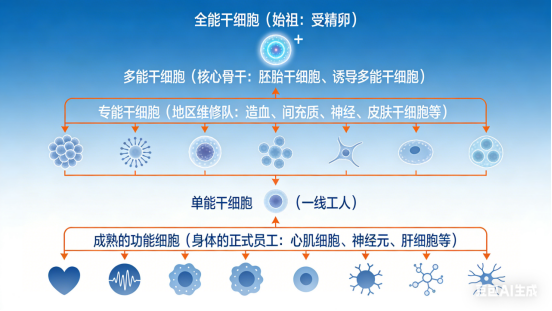 总结一下:干细胞家族是一个等级分明、各司其职的超级团队: