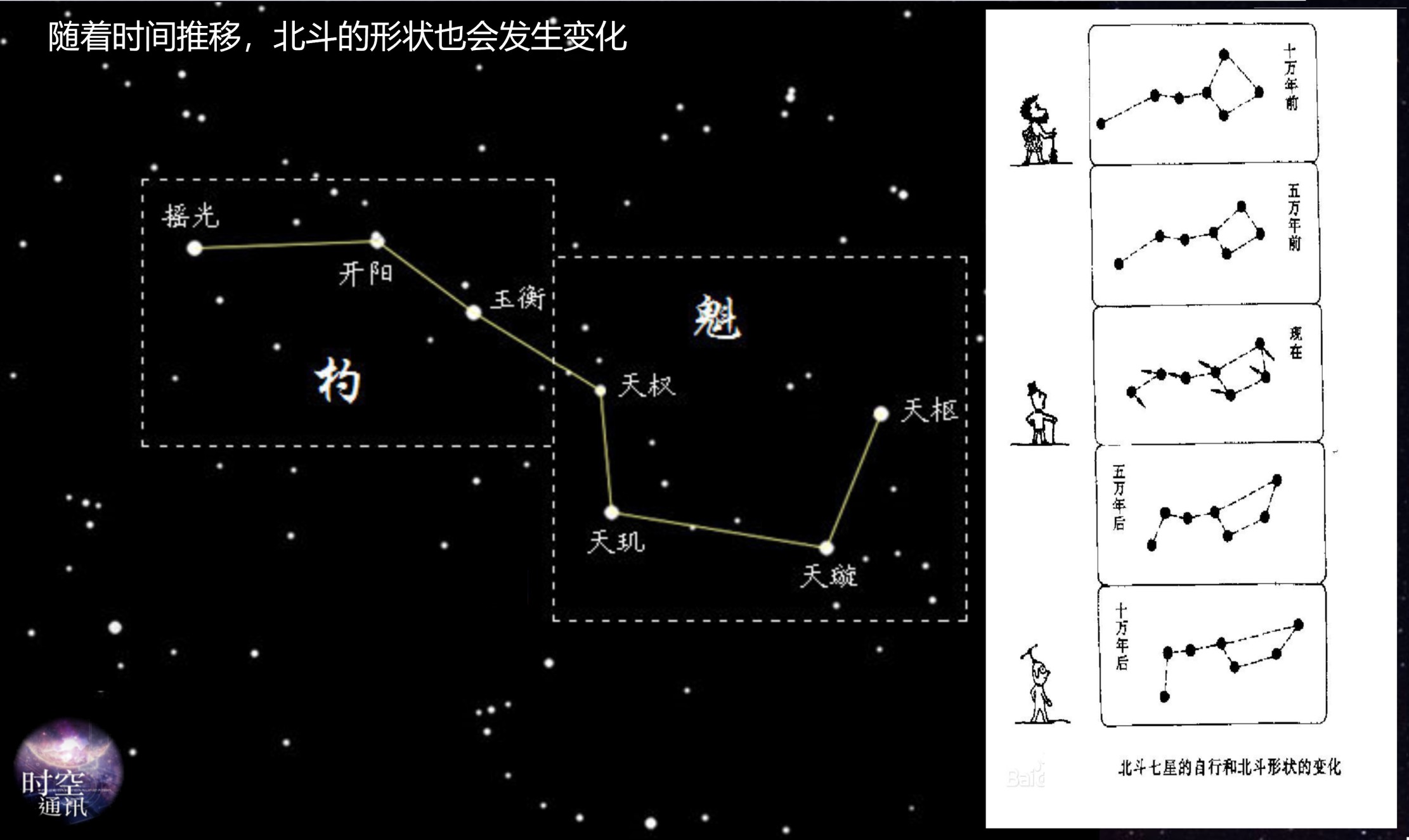 人类肉眼看到夜空中的星星,除了几颗太阳系内的行星,其余的都是银河系的恒星,这些恒星也和北斗七星一样,每时每刻除了围绕着银河系公转,也在自行运动,但这种自行运动相对与我们的距离和恒星之间的距离,都是很缓慢的,从古到今肉眼都难以看出变化,但经历10万年跨度,位置都会有明显的变化。