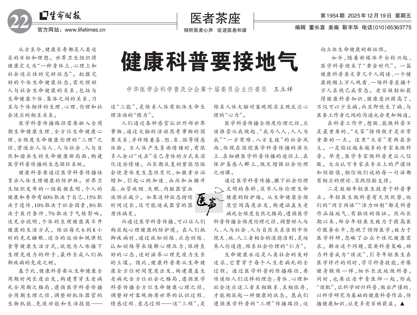 生命健康永远是人类社会的美好追求,它贯穿于每个人生老病死的全过程。通过医学科普的传播路径,要传递给人们这样的理念:身体、心理和社会适应这三者互相联系、互相依存,才能构筑起一种健康的状态。愿我们遵循医学科普的“三理”传播路径,迈向立体生命健康的新征程。
