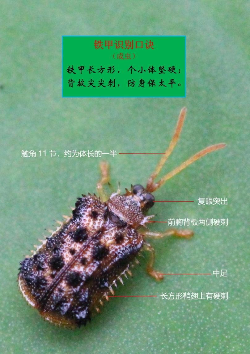 铁甲属于完全变态昆虫,一生经历卵、幼虫、蛹、成虫等四个生长时期,一般一年能够发生几代。成虫主要在叶面啃食单子叶和双子叶植物的叶片。幼虫潜入叶片组织内部啮食叶肉,留下上、下表皮形成黄色袋状膜囊,为害严重时,叶片会呈现一片枯白色,影响植物的正常生长发育,有些种类成为农林作物(竹类、水稻等)的重要害虫。 铁甲识别口诀和形态特征