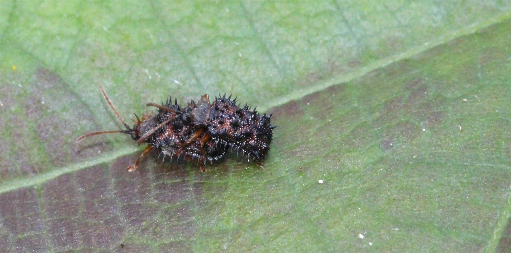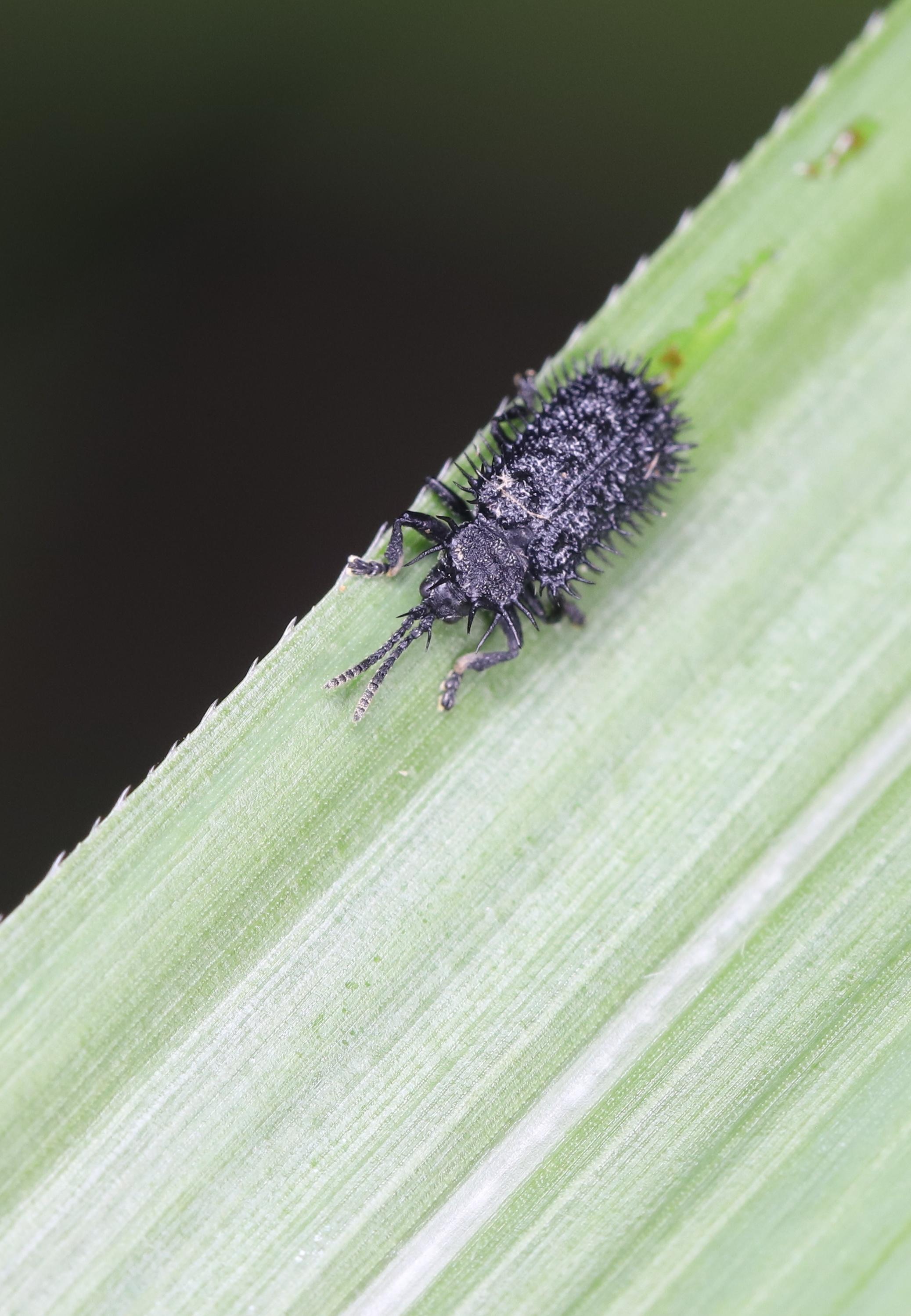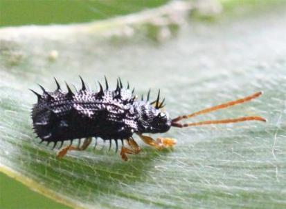 成虫感到危险降临时,会收缩六足趴在叶表,体表密密麻麻的硬刺如同刺猬,让捕食者望而生畏,无从下口。或者假装死亡从叶片上滚落逃走,让捕食者猝不及防。