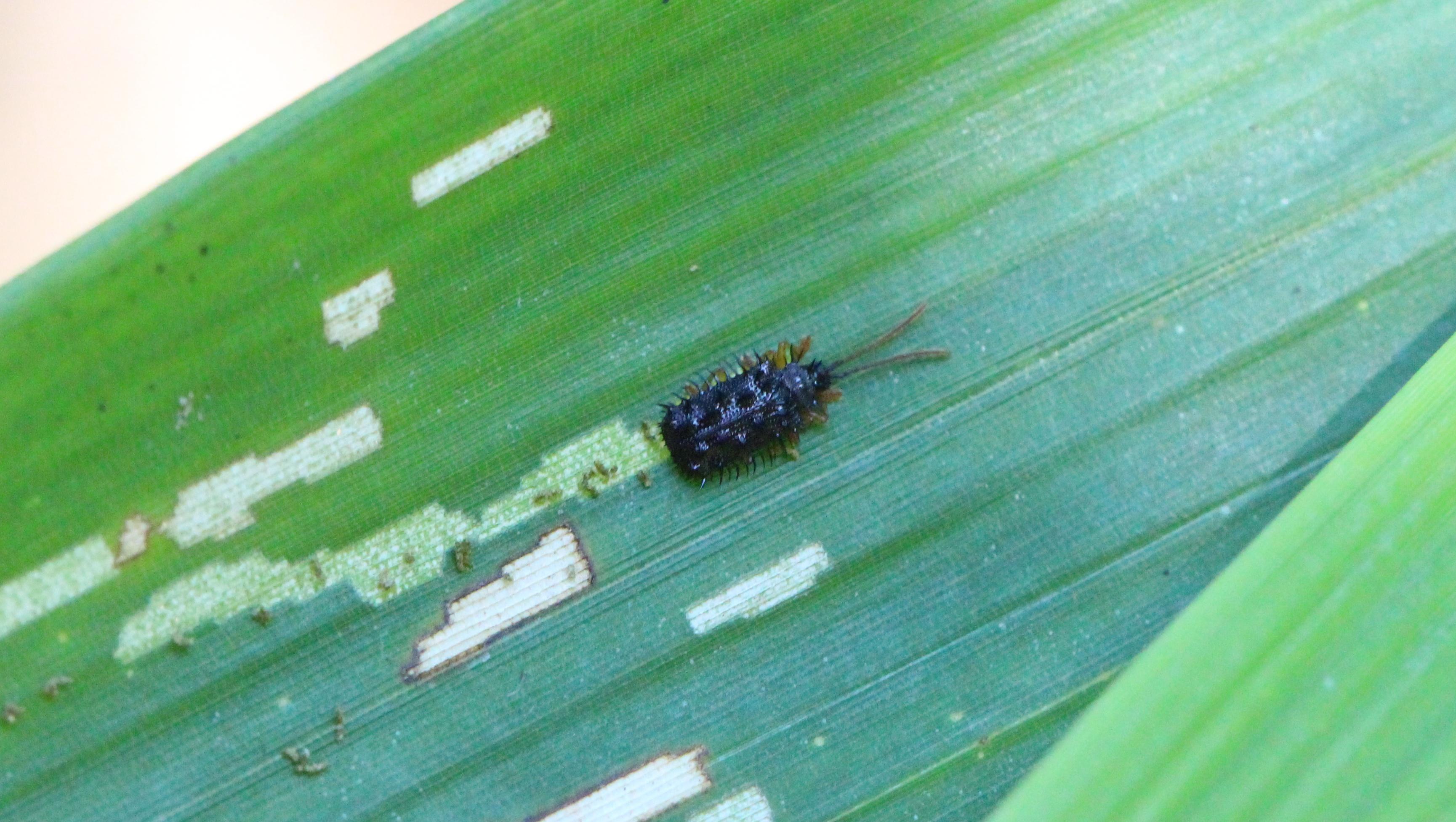 部分铁甲产卵前先用口器刮开叶片的表皮层,然后将卵产在叶表皮之内,每次一粒,产后用胶质密封加固,让卵在安全的环境中发育并孵化出健康的幼虫。